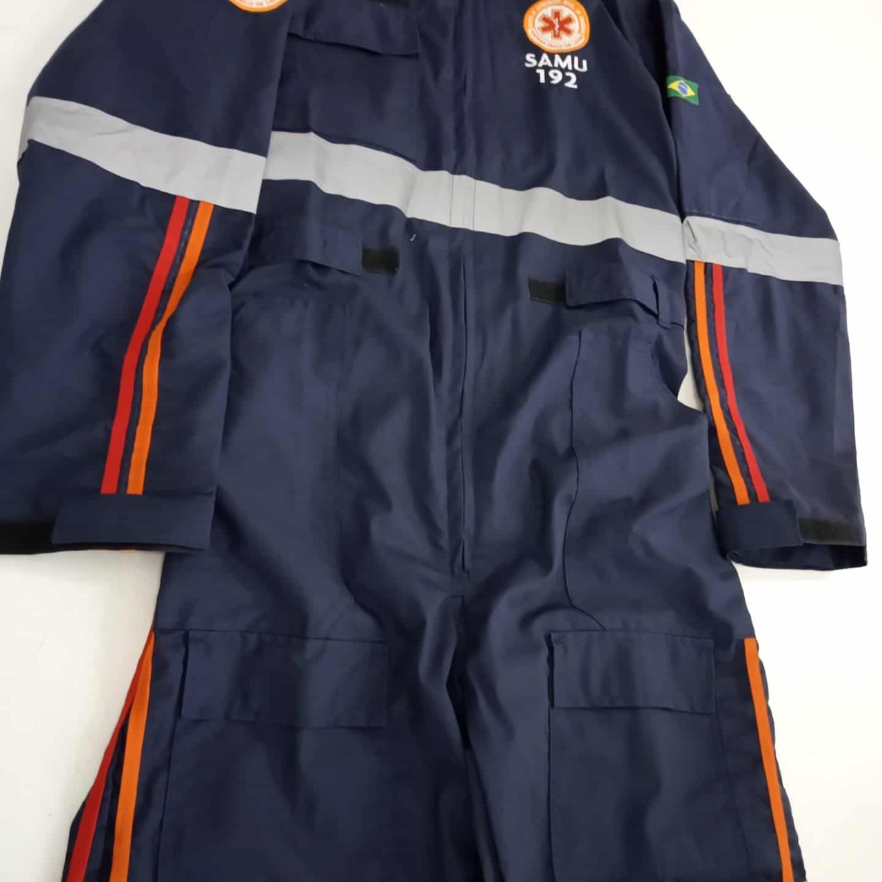 Macacão em rip stop azul marinho padrão SAMU, com bordado do SAMU frente costas e manga direita, bolso com tampa de velcro no peito e nas pernas, fechamento em zíper, manga longa destacável com zíper, faixa laranja e vermelha nas laterais e mangas, refletivo prata 5cm nas costas, frente, mangas e pernas. Tamanhos : PP - P - M - G - GG - XG